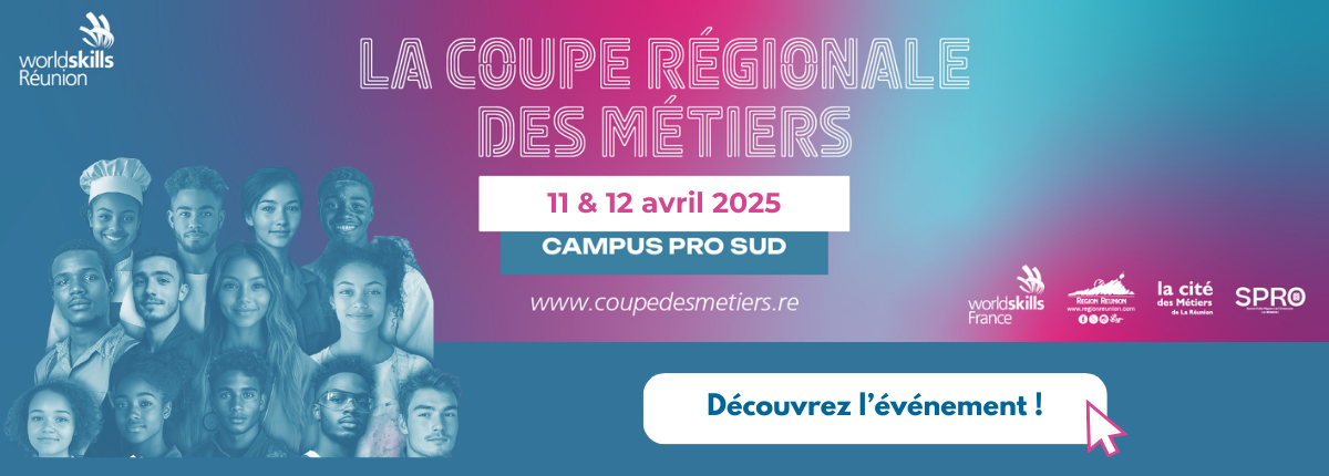 La Cité des Métiers de La Réunion, en partenariat avec la Région Réunion, est heureuse de vous inviter à promouvoir auprès de vos publics un événement exceptionnel : la Coupe Régionale des Métiers – WorldSkills Réunion 2025, qui se tiendra les 11 et 12 avril 2025, au Campus Pro Sud de Saint-Pierre.